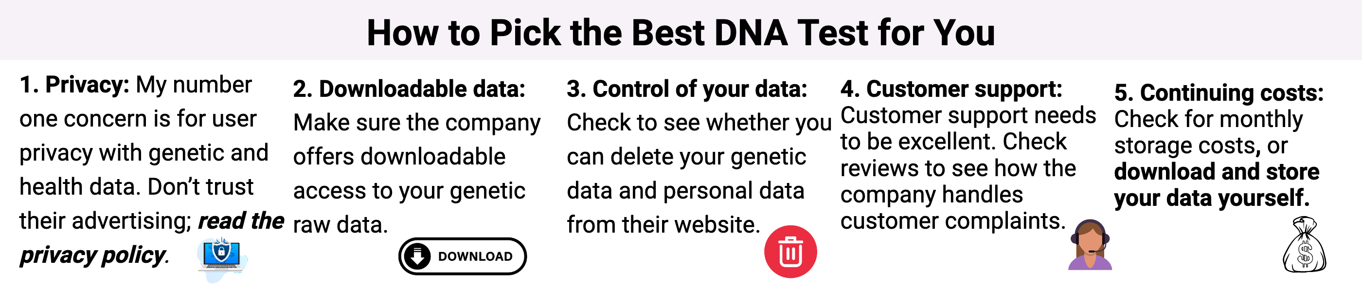 - Privacy: Don’t trust their advertising; read the privacy policy—especially the section on genetic data.