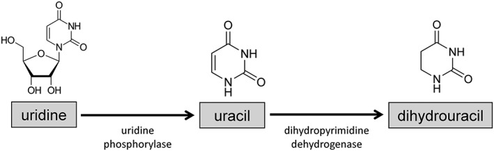 Specifically, dihydropyrimidine dehydrogenase converts uracil (found in RNA) to dihydrouracil, but this process also affects thymine (found in DNA) levels.