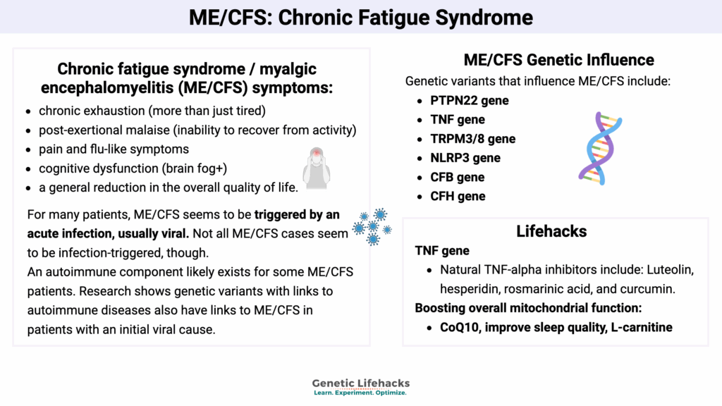 - ME/CFS: Myalgic Encephalomyelitis / Chronic Fatigue Syndrome, Genes, Immune Pathways, and SolutionsLearn which immune, mitochondrial, and genetic pathways—NK cells, NLRP3, interferon, complement, TRP channels, and more—may increase susceptibility to ME/CFS.
