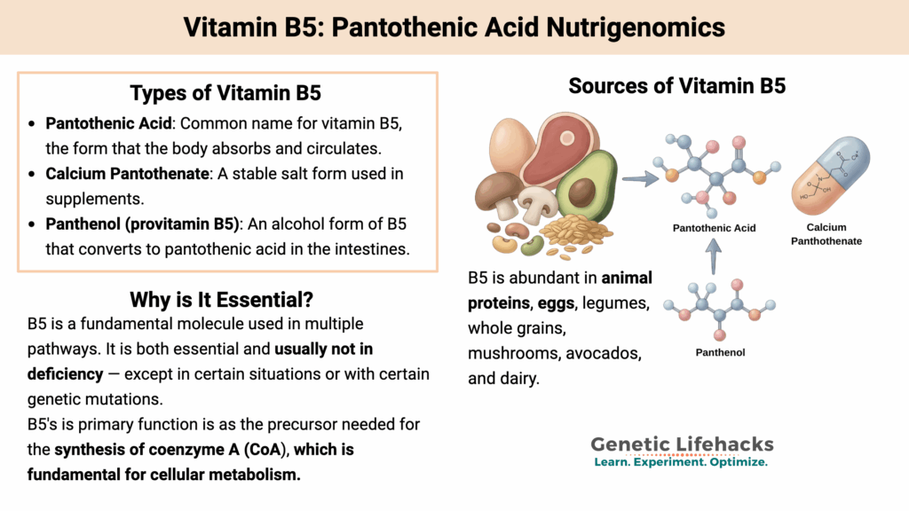 - Vitamin B5 (Pantothenic Acid): Genetics, Deficiency, and Neurodegenerative DiseasePantothenic acid (vitamin B5) is essential for coenzyme A synthesis and brain energy. Learn about B5 deficiency, PANK2 mutations, and links to Alzheimer’s.