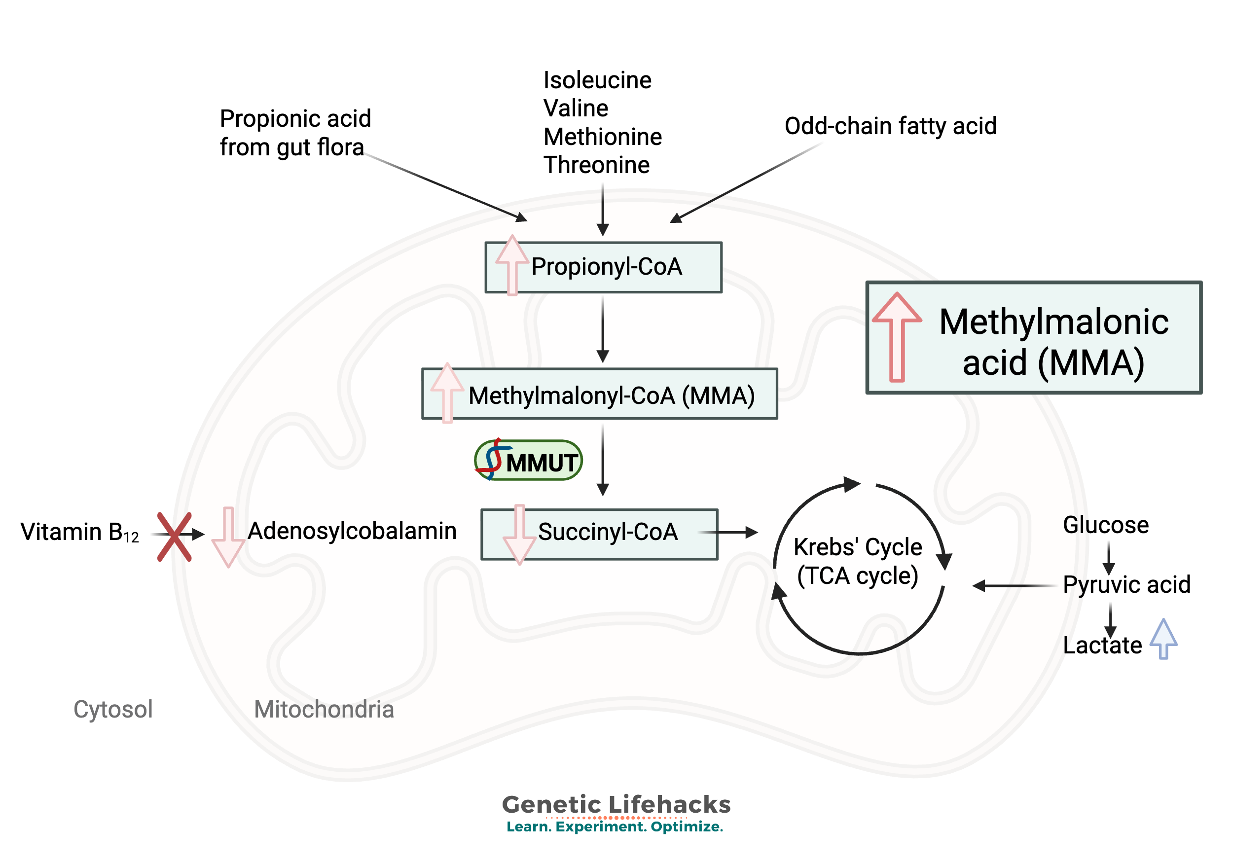 If the body lacks vitamin B12 or has two copies of a mutation in the MUT gene, the conversion process doesn’t happen at the right rate. This leads to a buildup of methylmalonic acid (MMA), called methylmalonic aciduria.