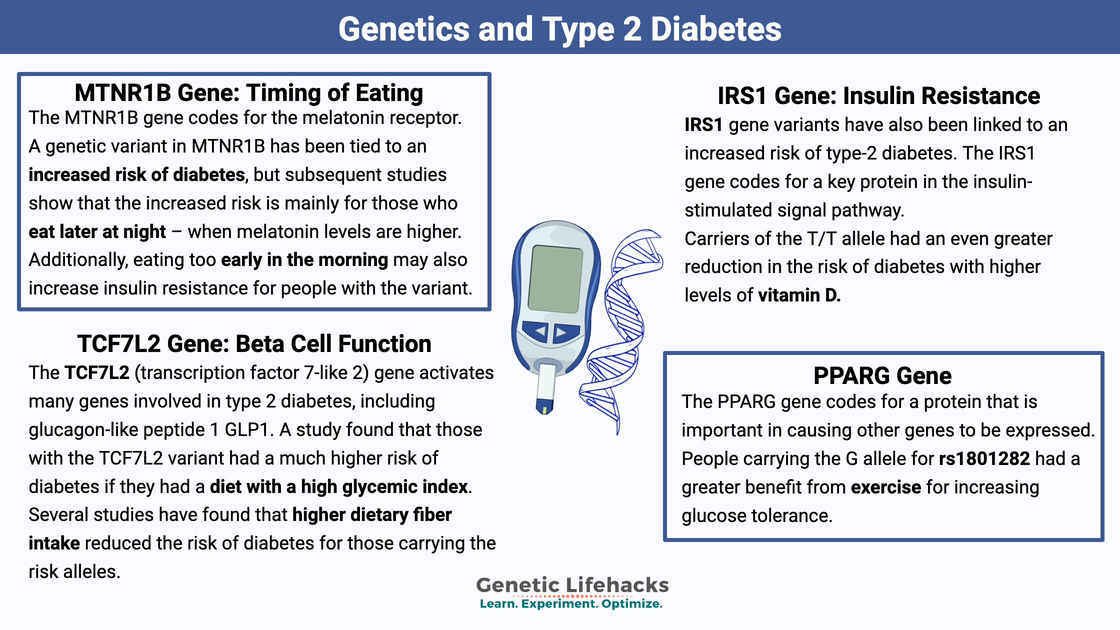 A printable guide for the genetic risk factors of diabetes. It includes specific genotypes that influence the risk of diabetes, along with possible lifestyle changes that can be implemented for better outcomes.